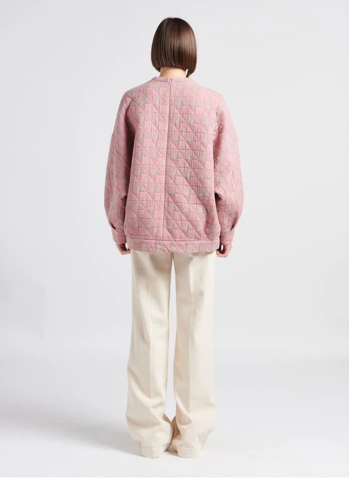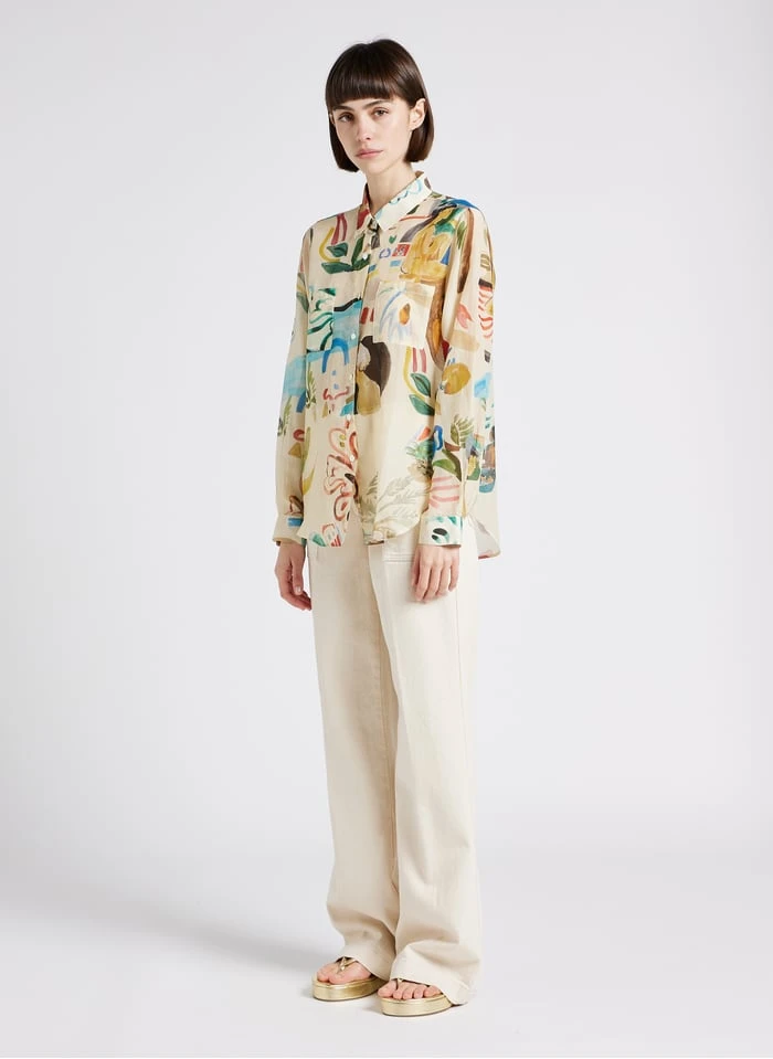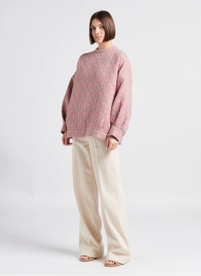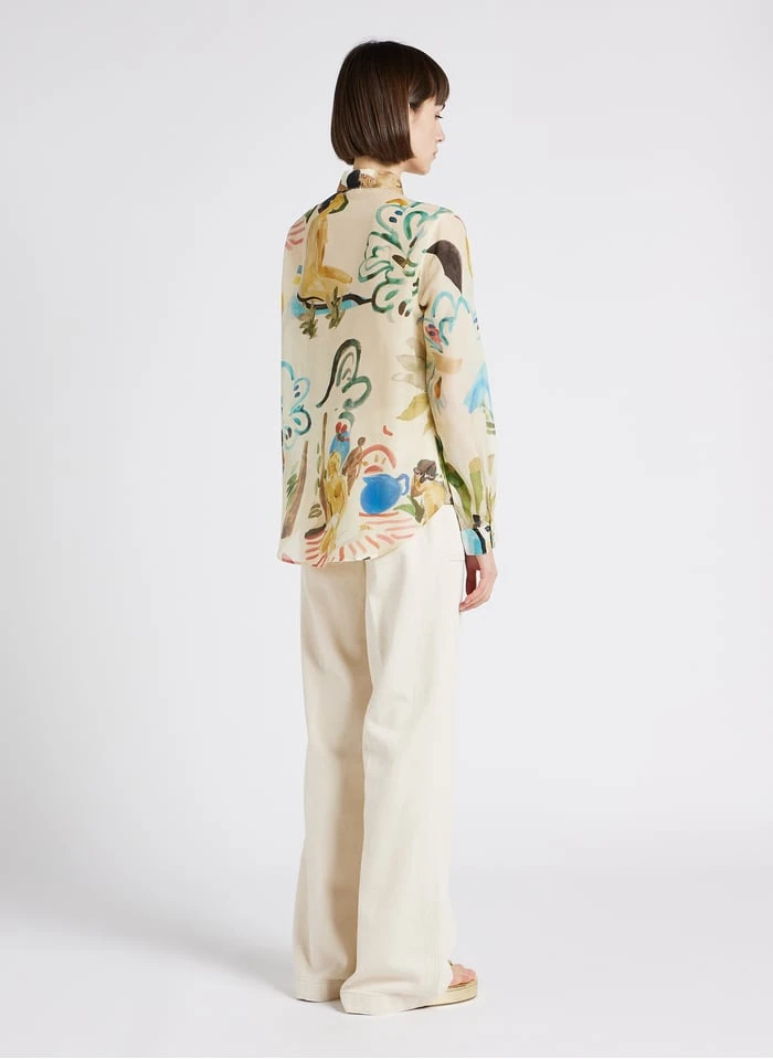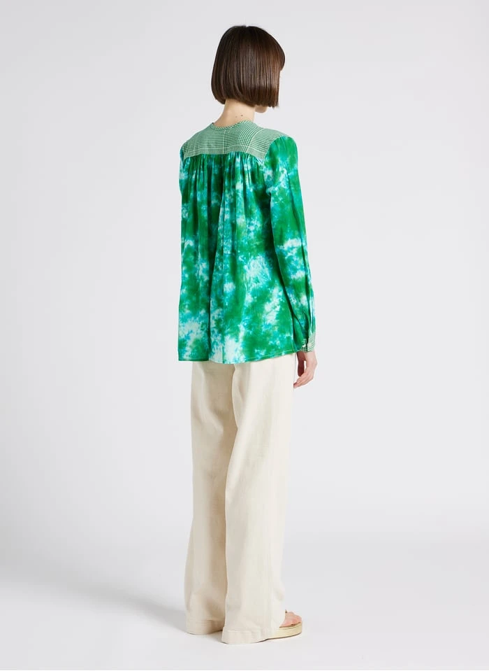 Dit model wordt aangeboden met Katoenen top met ronde hals en tie-dyeprint by V DE VINSTER, Leren schoudertas by V DE VINSTER