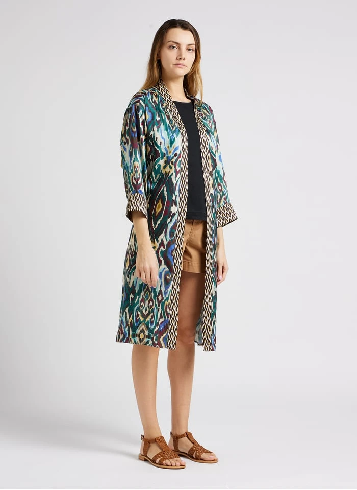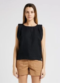 Dit model wordt aangeboden met Wijd short met hoge taille by MKT, Platte, leren sandalen by COULEUR POURPRE