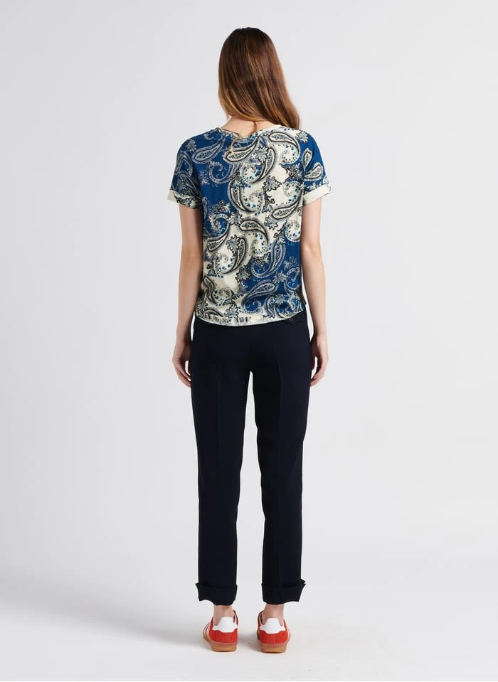 Dit model wordt aangeboden met Blouse met Maokraag en print by AN’GE, Lage, leren sneakers by ADIDAS