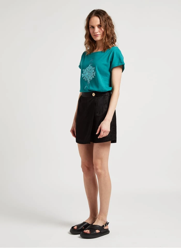 Dit model wordt aangeboden met Overslagshort met satijnglans by THE KORNER, Platte, leren sandalen by ALOHAS