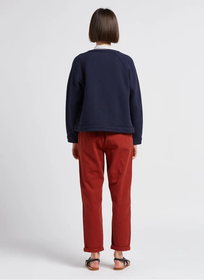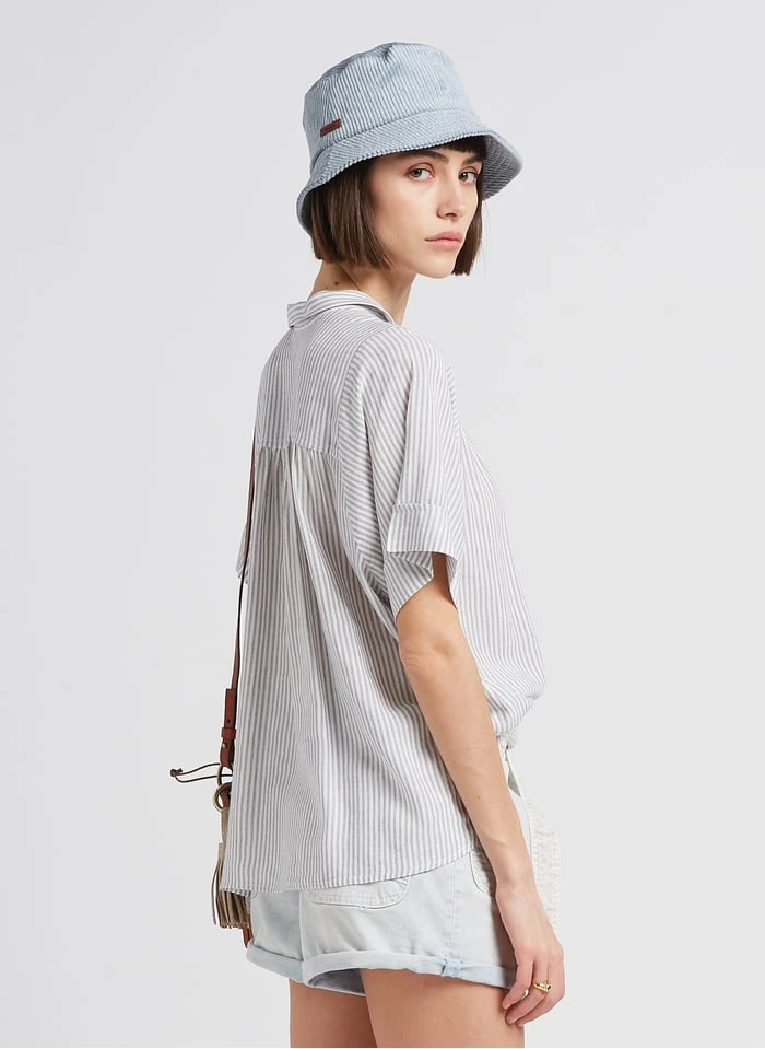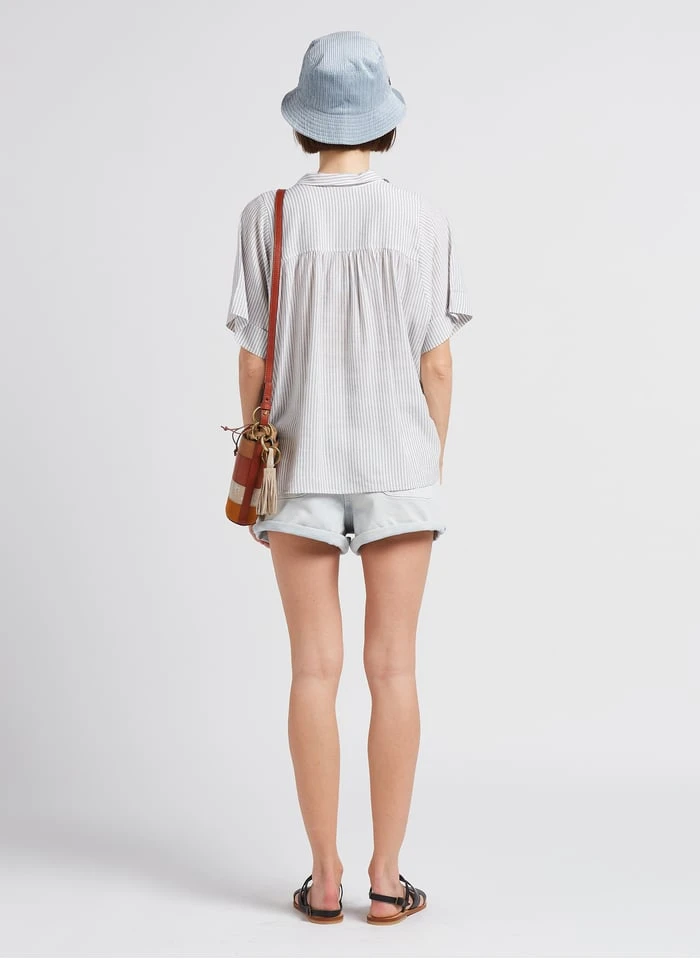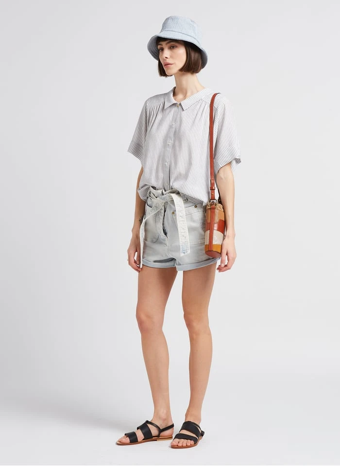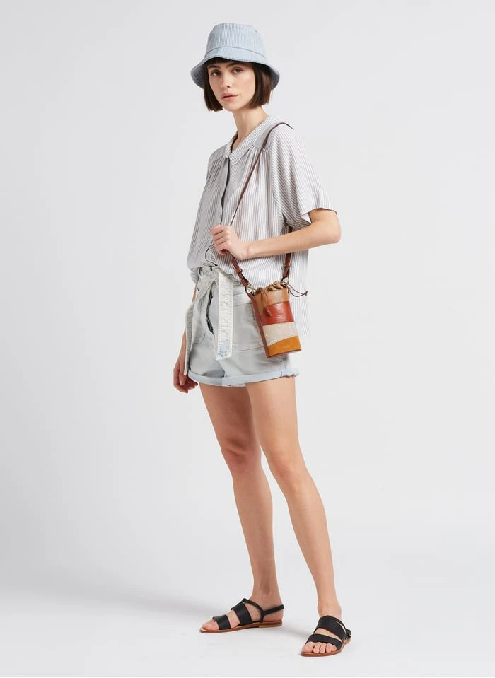 Dit model wordt aangeboden met Leren gsm-tasje met patchworkpatroon by SESSUN, Bobhoedje met ribtextuur katoenblend by SESSUN, Platte, leren sandalen by SESSUN, Spijkershort met hoge taille by SESSUN