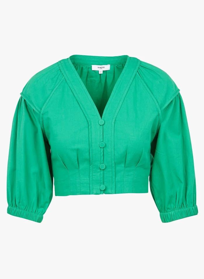 Dit model wordt aangeboden met Wijde, katoenen broek by SUNCOO, Leren sandalen by SUNCOO